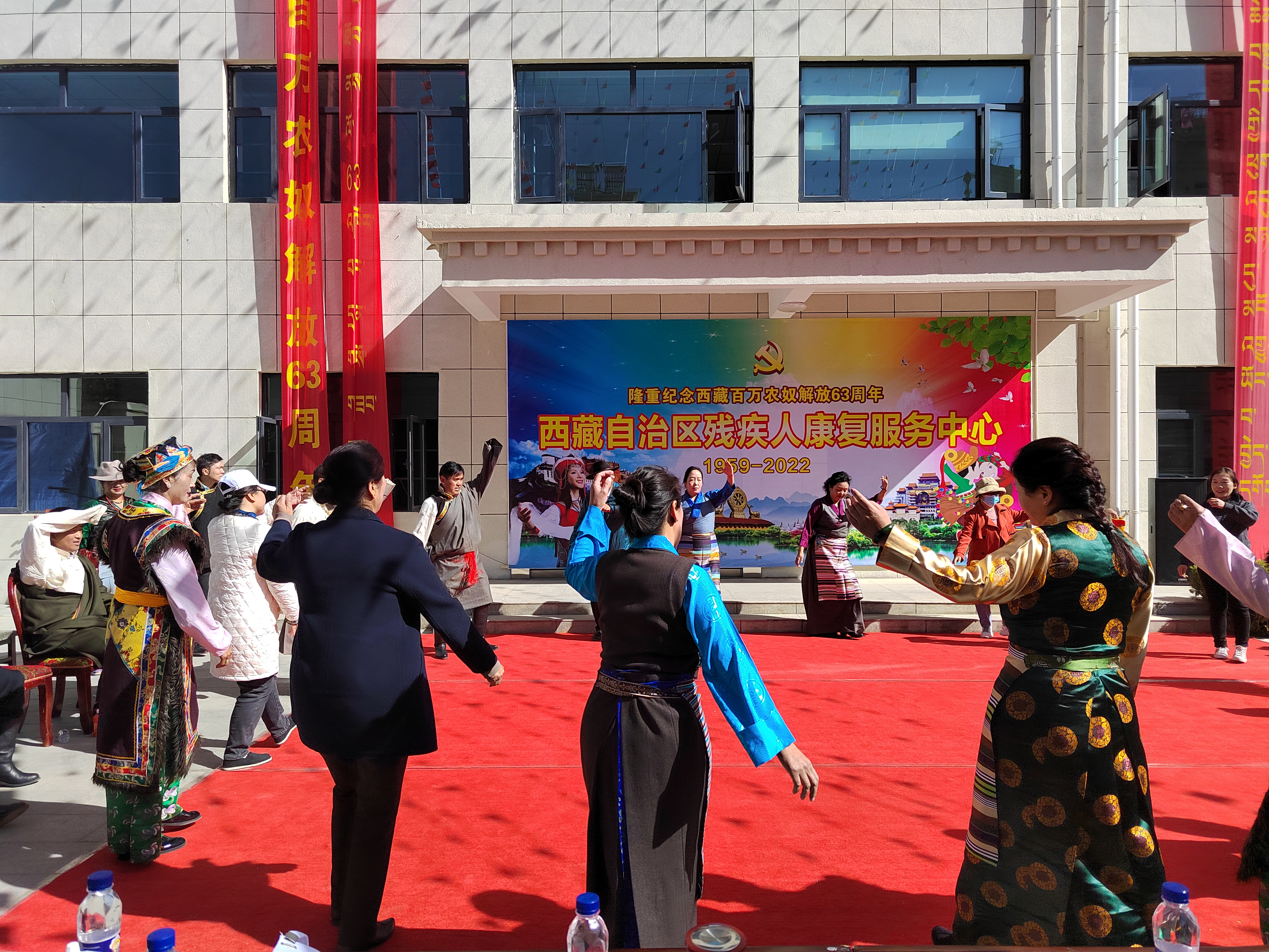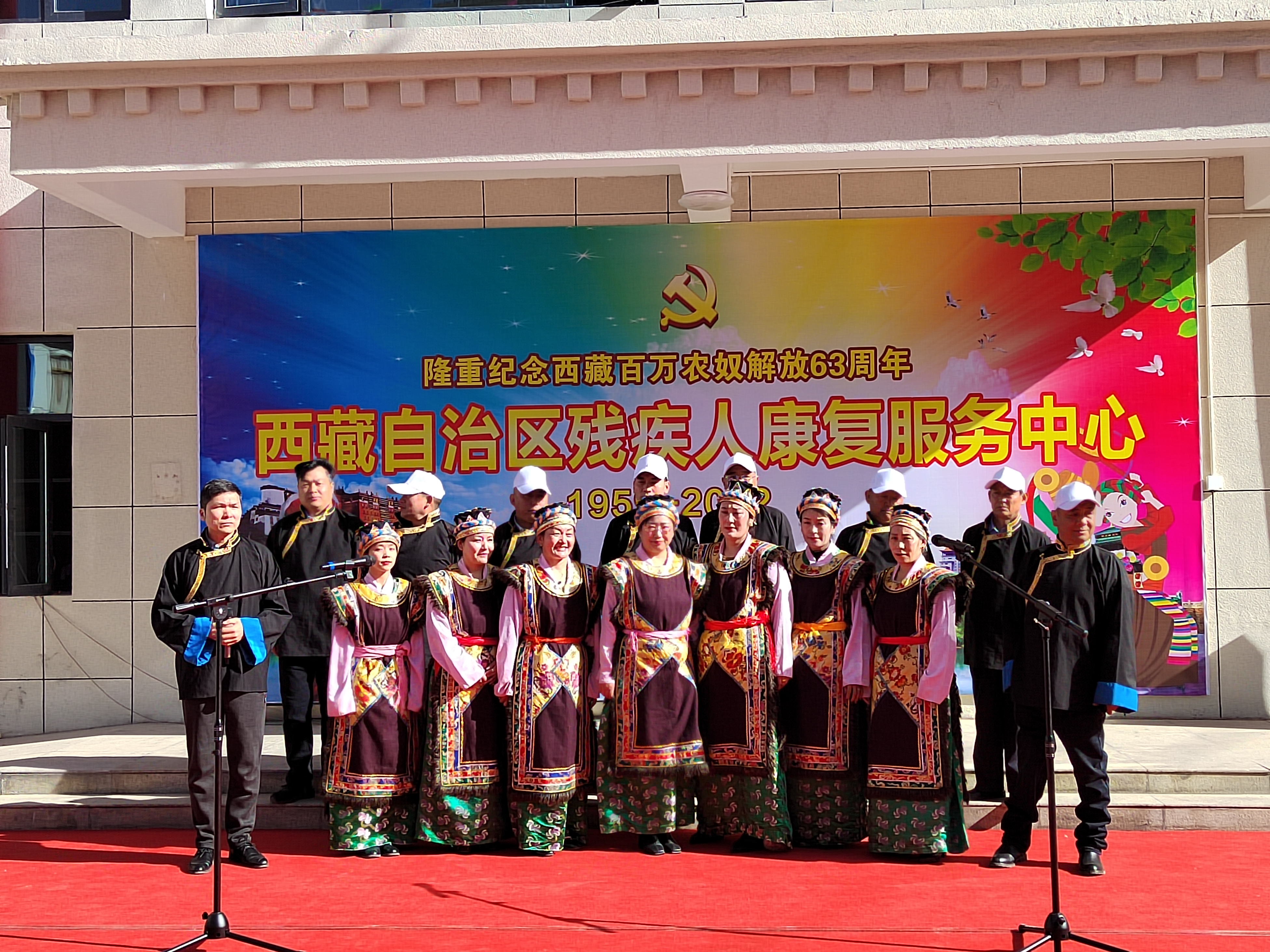 自治区残疾人康复服务中心全体干部职工自编自演了《中国么么哒》、《感恩的心》《大中国》、《最美的歌儿献给妈妈》等丰富多样的节目和趣味游戏活动,优美的歌声,热情的舞蹈,欢快的锅庄充分彰显了干部职工对社会主义的热爱,对伟大祖国的赞美,与康复服务对象一起纪念西藏百万农奴解放63周年。