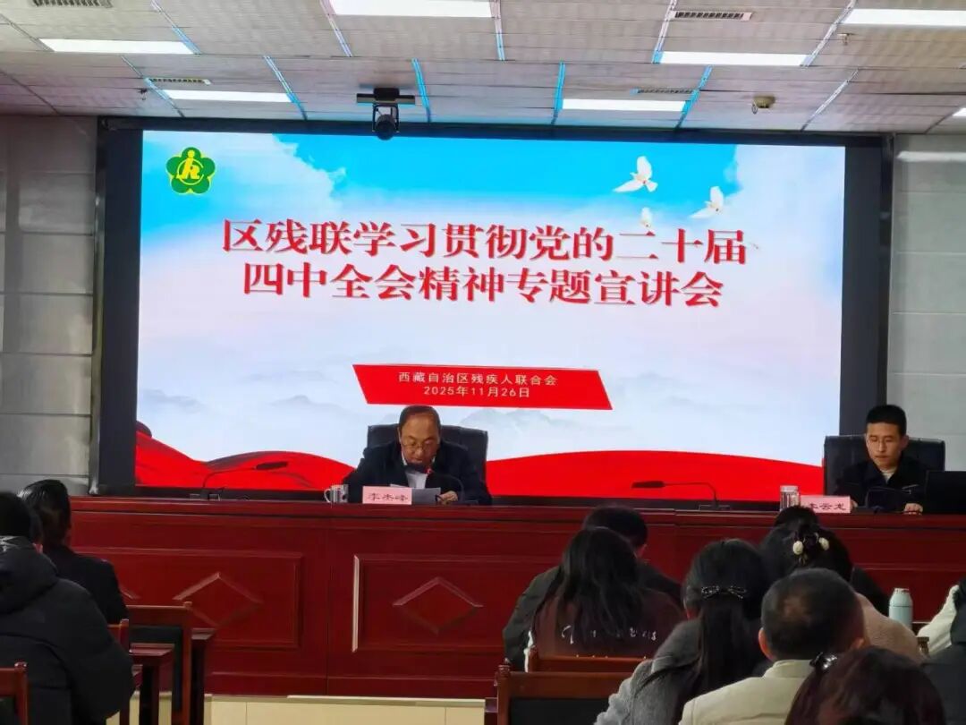 宣讲结束后,李杰峰副理事长作总结讲话,并结合残联工作实际,就推动全会精神落地见效提出四点要求:一是提高政治站位,深刻领悟党的二十届四中全会重大意义。要将学习贯彻全会精神作为当前和今后一个时期的重大政治任务,通过专题学习、研讨交流等形式,持续深化对精神实质的理解,不断增强贯彻落实的政治自觉、思想自觉和行动自觉,切实把学习成果转化为推动残疾人事业发展的强大动力。二是聚焦主责主业,进一步增强贯彻落实党的二十届四中全会的力度。要紧扣残疾人“急难愁盼”问题,扎实推进惠残工作落地;多渠道拓宽残疾人就业路径,强化就业帮扶;完善残疾人康复制度,实施精准化康复服务,提升服务质量;加强与教育部门协同,全面落实惠残助学政策,保障残疾人受教育权利;持续举办残疾人文艺汇演、下乡巡演等活动,繁荣残疾人文化体育事业;优化残疾人专项补贴政策,推动“两项补贴”提标扩面,构建多层次社会保障体系,切实增强残疾人的获得感、幸福感、安全感。三是服务工作大局,积极营造学习宣传党的二十届四中全会精神的浓厚氛围。要在残联系统内持续营造民族团结浓厚氛围,要通过政策宣传、典型引领等方式,引导广大残疾人听党话、感党恩、跟党走,共同为建设富强民主文明和谐美丽的社会主义现代化新西藏、筑牢祖国西南边疆安全稳定屏障贡献残疾人力量。四是突出重点,认真总结年度工作任务完成情况。积极统筹谋划明年重点工作,要坚持问题导向,系统思维破解难题突破瓶颈,进一步改进作风,以科学编制残疾人事业发展“十五五”规划为契机,集中人力、物力、财力,齐心协力抓好落实,把政策优势转化为推动残疾人事业发展的强大动力,高质量完成全年工作,为开启“十五五”规划夯实基础。